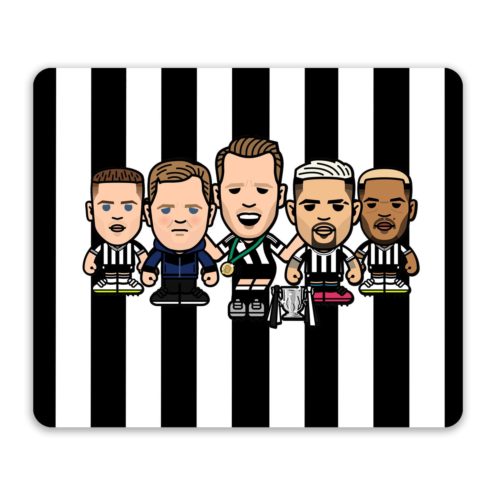 An exclusive mouse mat featuring Newcastle dancing Dan Burn, Bruno Guimaraes, manager Eddie Howe, Joelinton and Harvey Barnes.