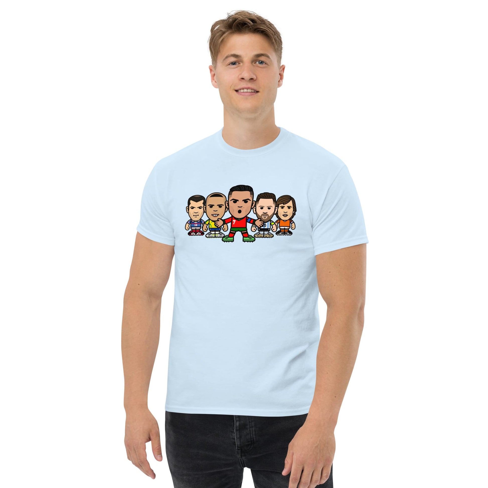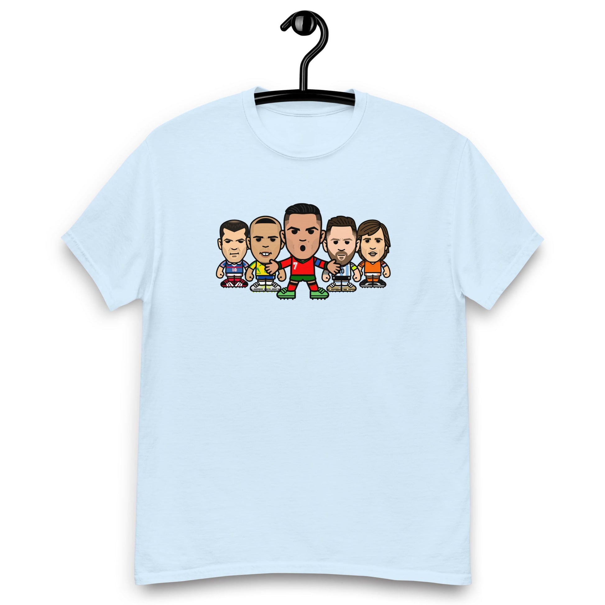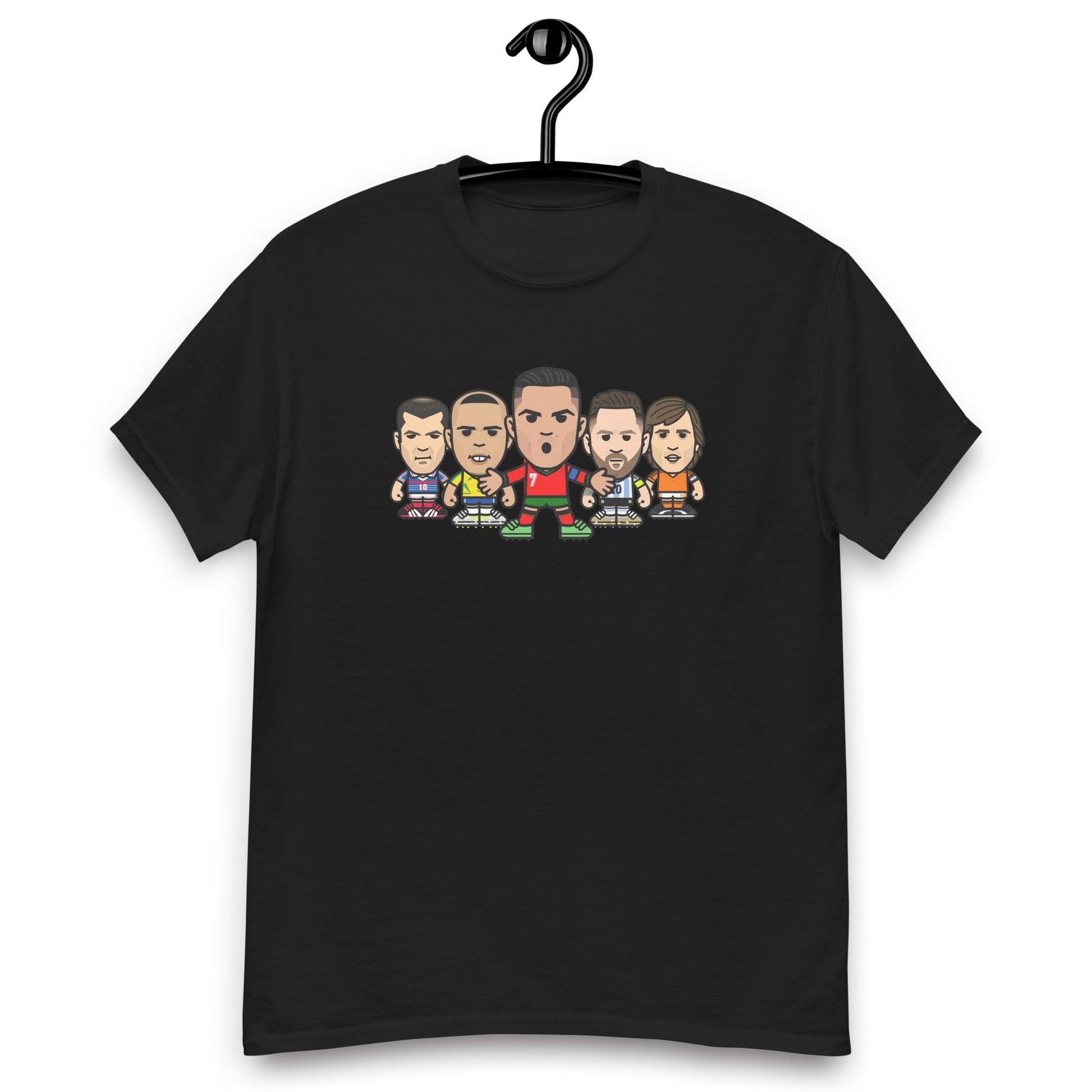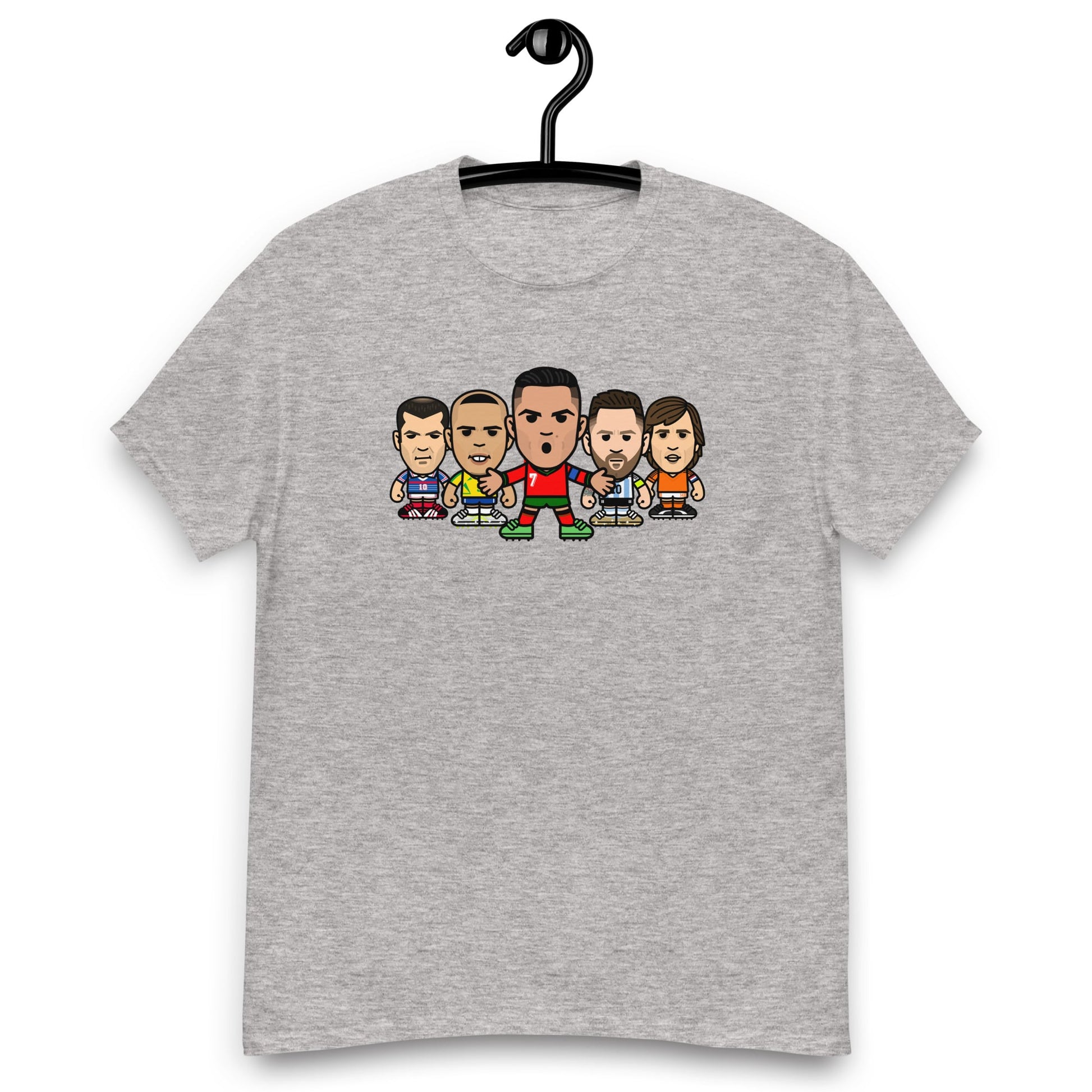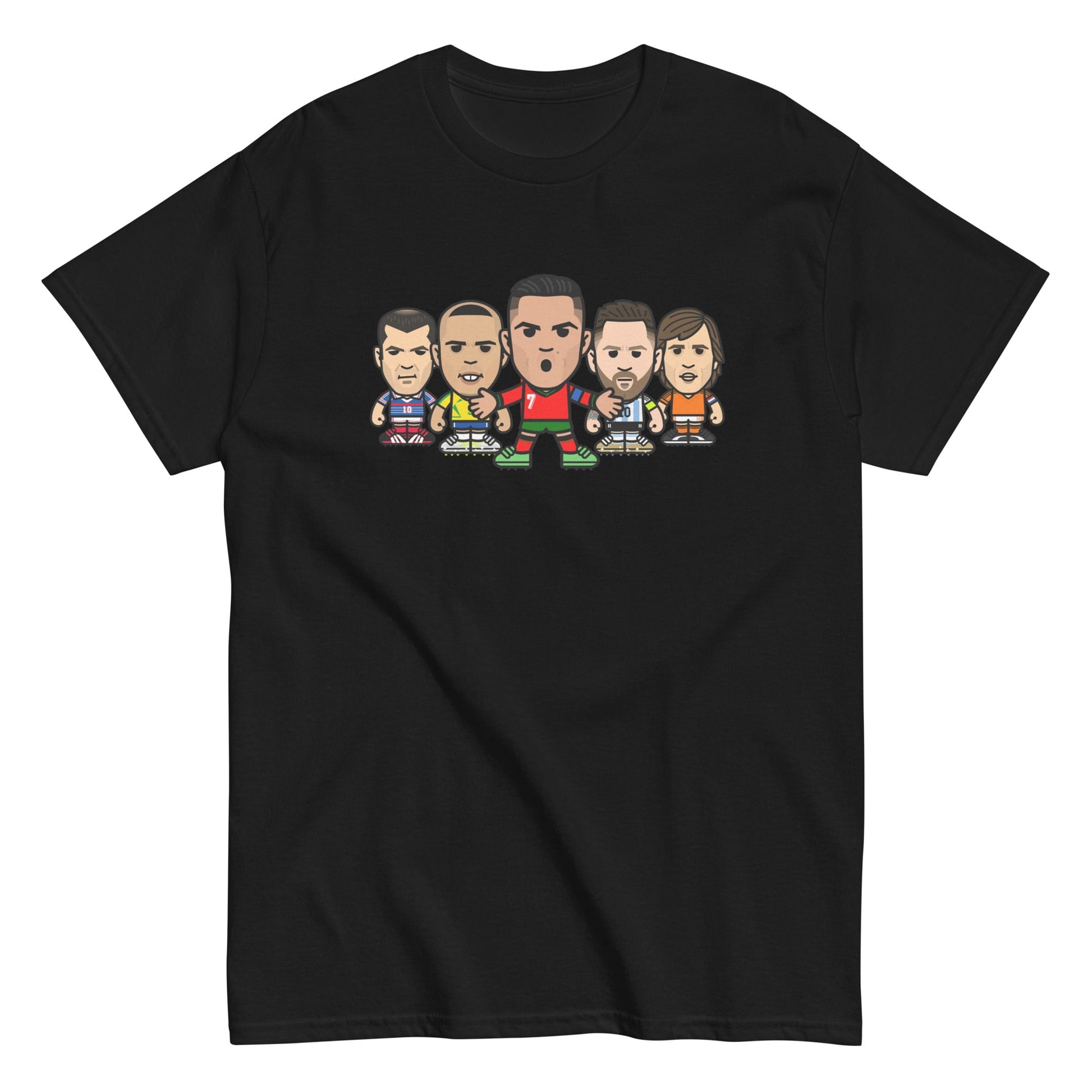An exclusive t-shirt featuring some of the footballing greats Cristiano Ronaldo, Lionel Messi, Ronaldo, Zinedine Zidane and Johan Cruyff.